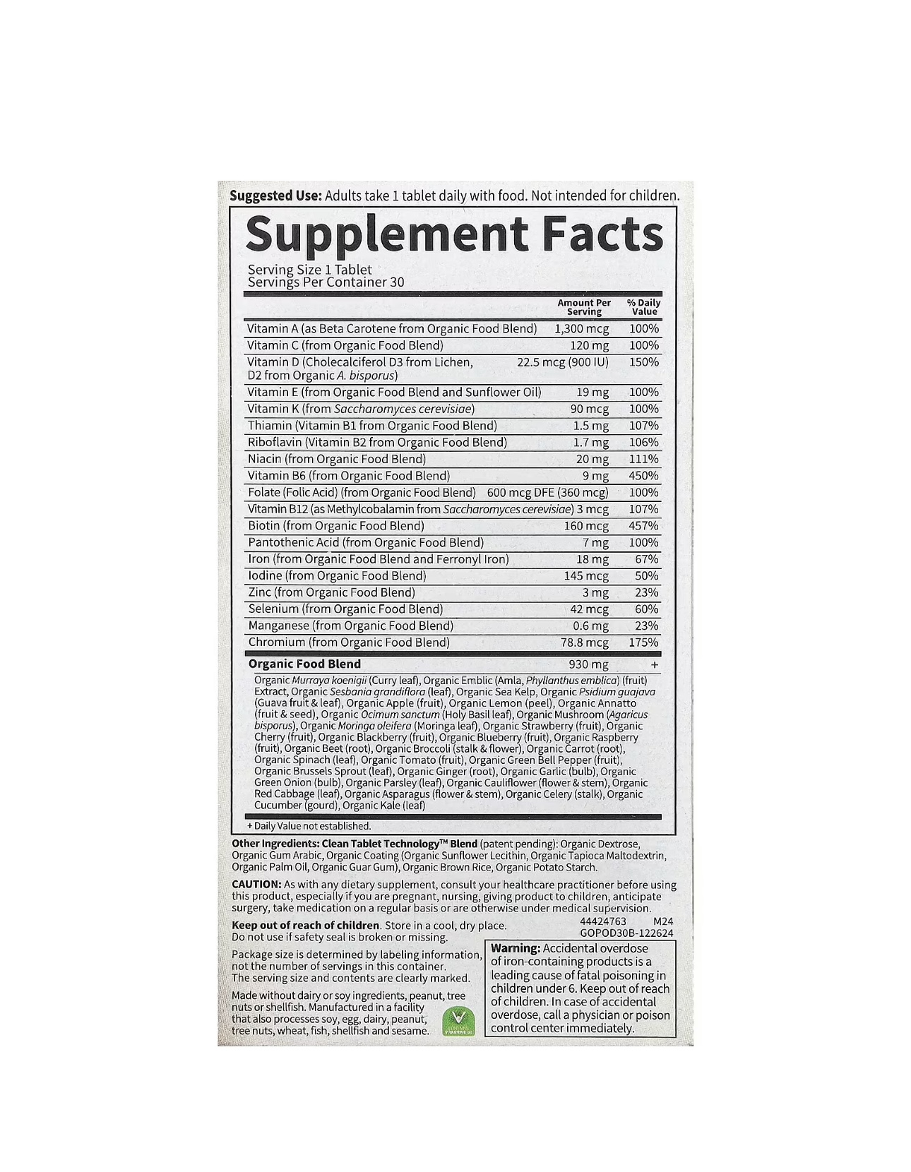 Мультивитамины из цельных пищевых продуктов — это сертифицированный органический комплекс из натуральных питательных пищевых ингредиентов, проверенный на отсутствие ГМО