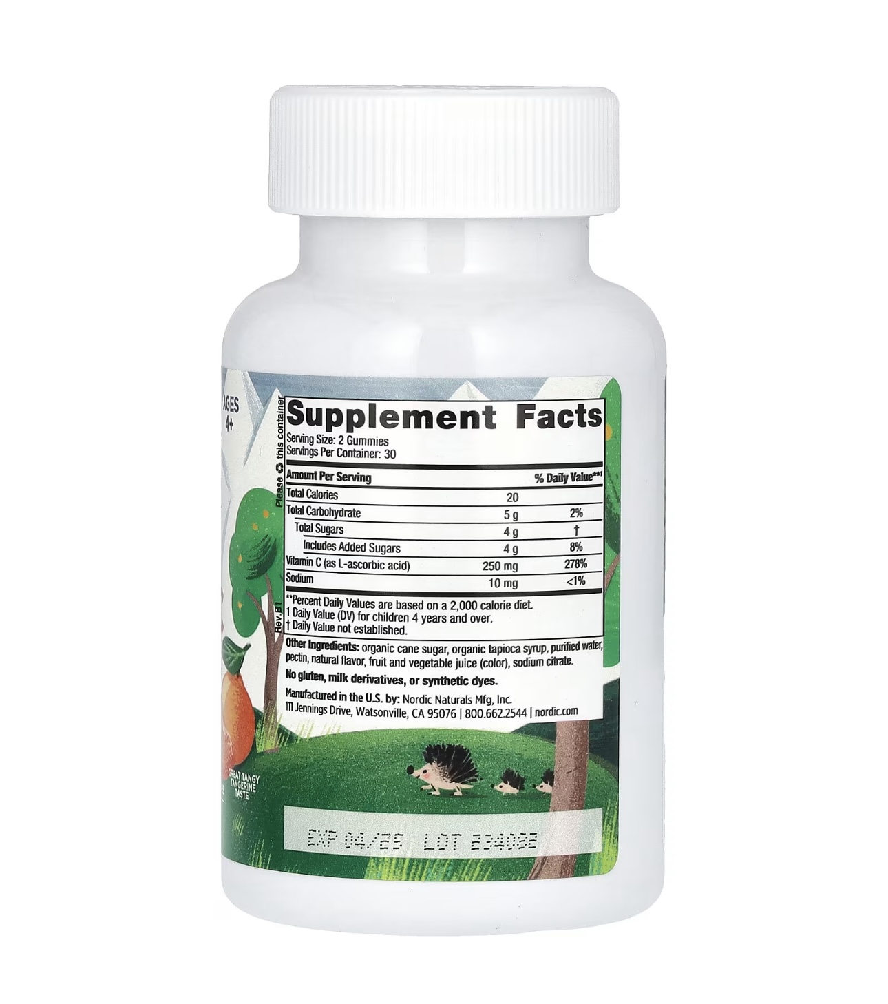 Витамин C — важное питательное вещество, необходимое детям для роста и развития. Витамин C не только поддерживает многие физиологические функции организма, но и поддерживает здоровье иммунной системы и обеспечивает антиоксидантную защиту. Детские жевательные таблетки с витамином C от Nordic Naturals — это вкусные кислые жевательные ломтики со вкусом мандарина, которые подходят для детей от 4 лет.