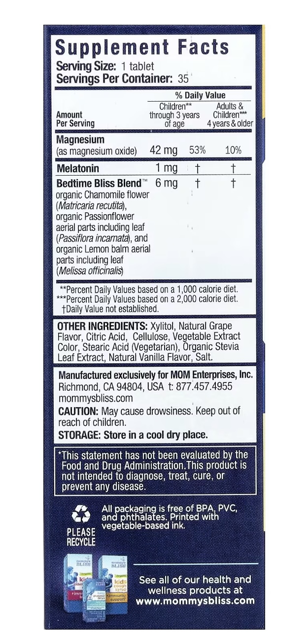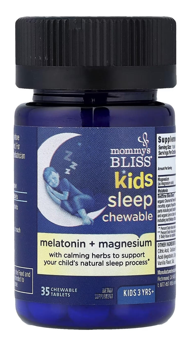 Детские жевательные таблетки для сна содержат запатентованную смесь мелатонина, магния, органической ромашки, мелиссы и пассифлоры, которые способствуют спокойному и умиротворённому сну.